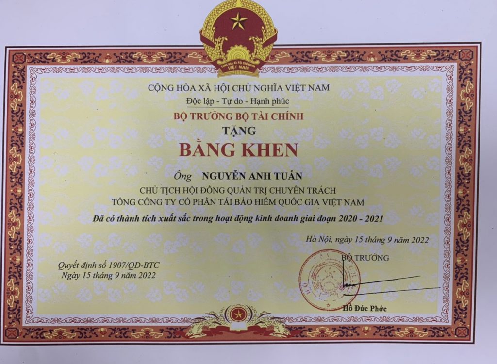 Căn cứ vào thành tích kinh doanh giai đoạn 2020 – 2021, ngày 15/9 vừa qua, Bộ Tài chính đã có bằng khen cho tập thể Tổng Công ty cổ phần Tái bảo hiểm Quốc gia Việt Nam (VINARE) vì “đã có thành tích xuất sắc trong hoạt động kinh doanh giai đoạn 2020 – 2021”. Bên cạnh đó, ông Nguyễn Anh Tuấn- Chủ tịch Hội đồng quản trị VINARE cũng được Bộ tài chính trao tặng Bằng khen “cá nhân có thành tích xuất sắc trong giai đoạn kinh doanh 2020 – 2021”. Các thành tích của tập thể và cá nhân là minh chứng cho những đóng góp của VINARE trong việc thúc đẩy toàn thị trường bảo hiểm vươn lên đạt những kết quả khả quan trong năm 2021, một năm biến động do ảnh hưởng của đại dịch Covid-19. VINARE một lần nữa khẳng định vị thế của doanh nghiệp tái bảo hiểm hàng đầu tại thị trường bảo hiểm trong nước cũng như uy tín trên thị trường quốc tế.